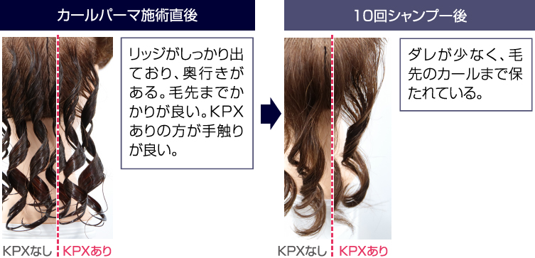 ウェーブパーマのかかりを検証。トリートメントKPXを使用すると、リッジがしっかりと出ており、10回シャンプーしてもダレが少なくなっています。