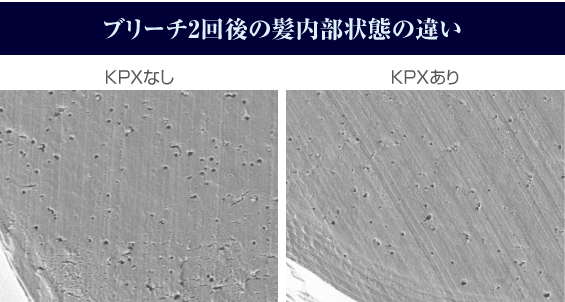 トリートメントKPXなし・ありでブリーチを2回繰り返した髪の内部の写真。KPXなしはダメージホールがたくさんできていますが、KPXありではダメージホールが少なくなっています。