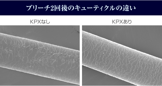 トリートメントKPXなし・ありでブリーチを2回繰り返した髪のキューティクルの写真。KPXなしはキューティクルが荒れてしまっていますが、KPXありではキューティクルが整っています。