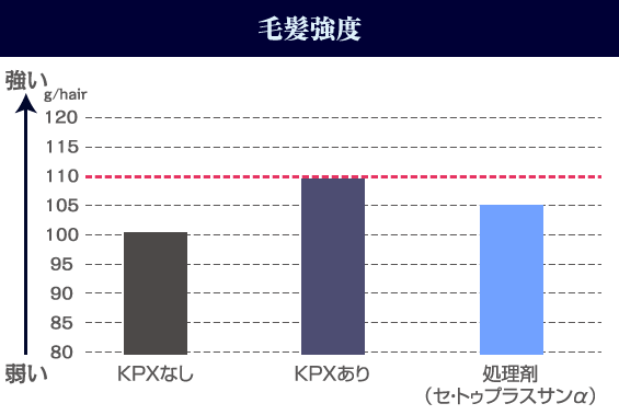 ブランクや処理剤に比べ、KPXを処理した毛髪は強度が保たれています。