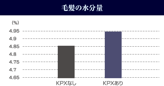 ブリーチをした毛髪の水分量から、ドライヤーや湿度で変動する水分量を除き、本来毛髪に留まっている水分量(結合水の量)を測定。KPXを使用した毛髪の方が、水分を多く抱え込んでいるのがわかります。