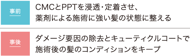 髪に不足したCMC・PPTを補う事前処理、施術後の残留物除去とデリケートなキューティクルをしっかりコートする事後処理。