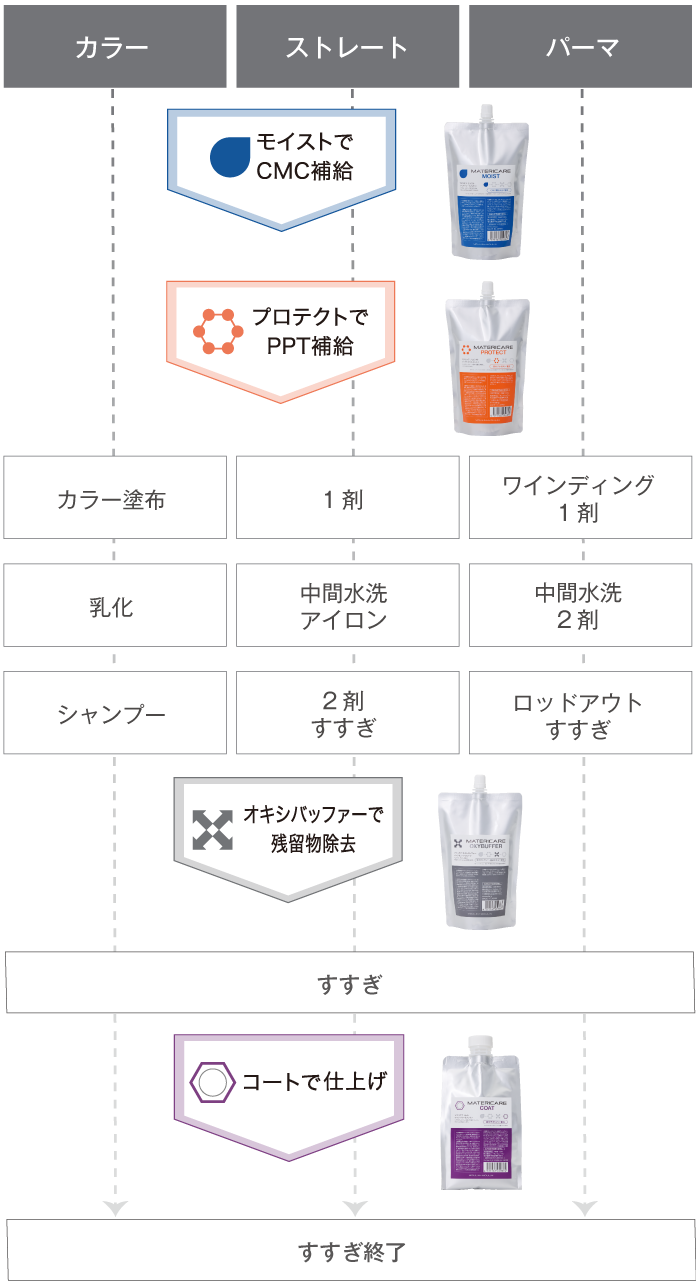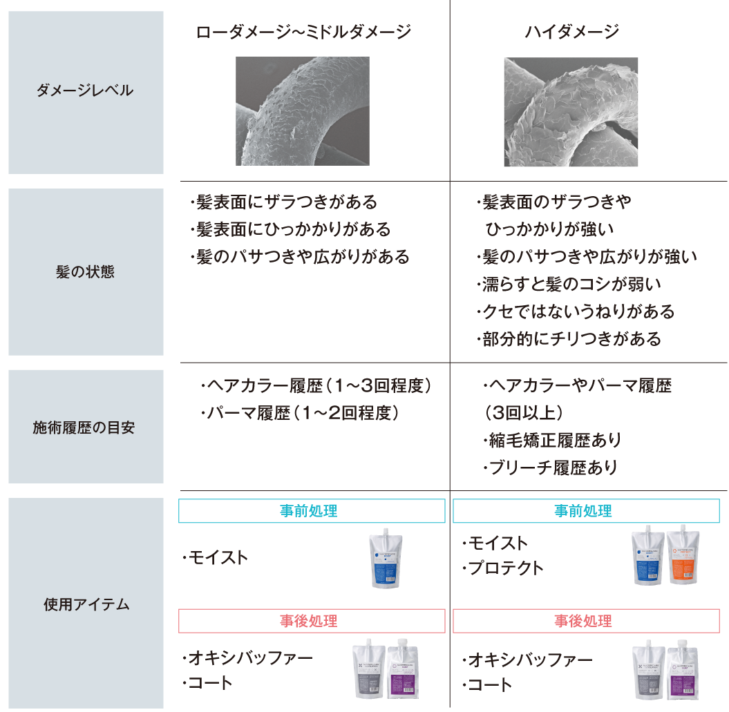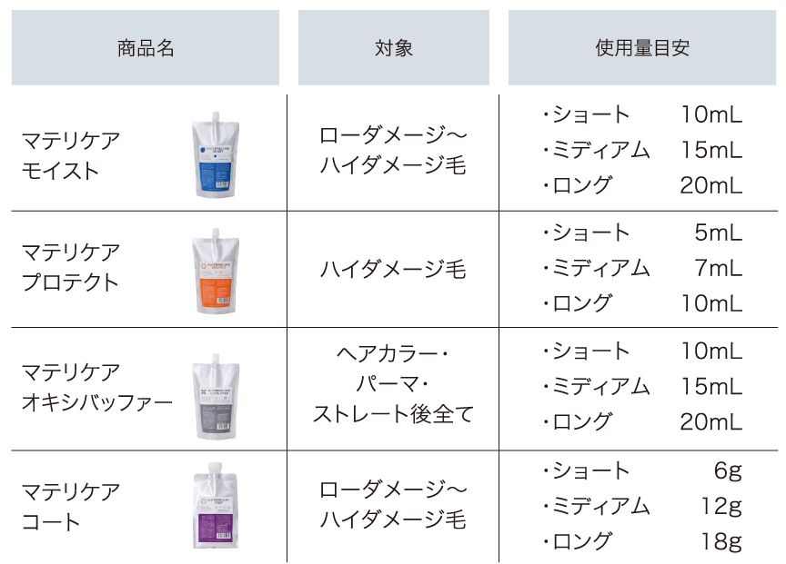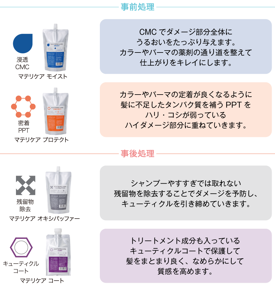 注意:チリつきや断毛がある・濡らしたときにクタっと芯が無い髪などは、マテリケアを使用してもダメージが進行する場合があります。ダメージの状態に合わせて、施術の判断をお願いします。