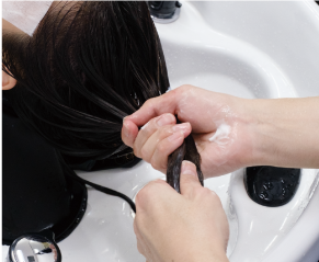 - ダメージ部分や毛先を中心にしっかりもみ込み、コーミングでなじませ、すすぎます。