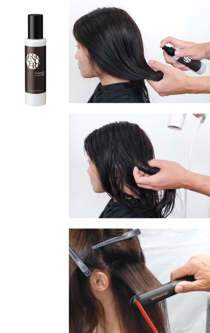 - ダメージが大きい部分には、事前に「リノヴィール エッセンスミスト」を使用するとスムーズに施術でき、なめらかな手触りに仕上がります。