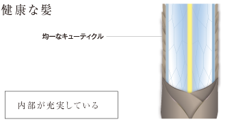 髪がダメージを受けた状態になると、髪の内部成分が流出して空洞ができます。この空洞と薄くなってゆがんだキューティクルが原因で髪質の変化が生じます。