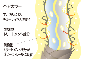 ヘアカラーでキューティクルを開き、トリートメントミルクまたはジュレに配合されている架橋型トリートメント成分※を内部に浸透させます。