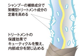 シャンプーで髪内部に浸透させた成分の定着を高め、トリートメントでキューティクルを整えて閉じ込めます。