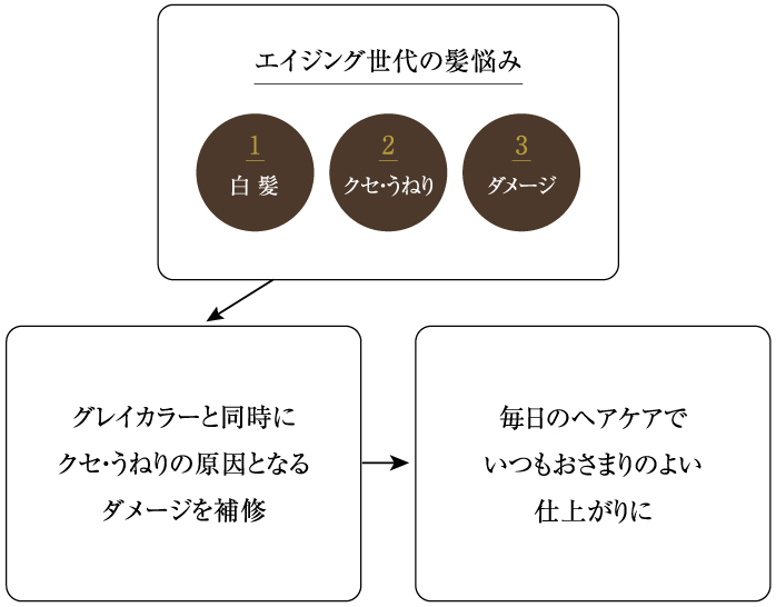 グレイカラーのお客さまを対象に行い、通常のカラーと同じ工程で施術が可能で、