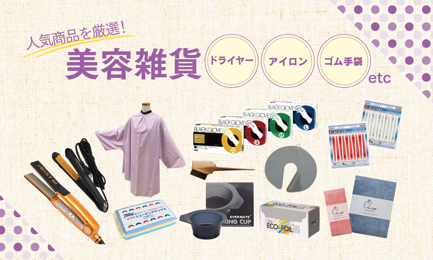 お取扱い商品:加温機、チューブ絞り、ストレートアイロン、カールアイロン、ドライヤー、トリマー、バリカン、スケール、タイマー、カーラーなど。