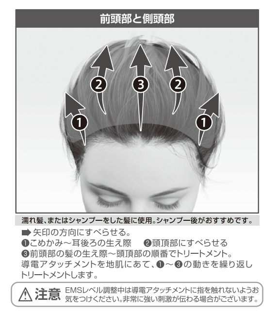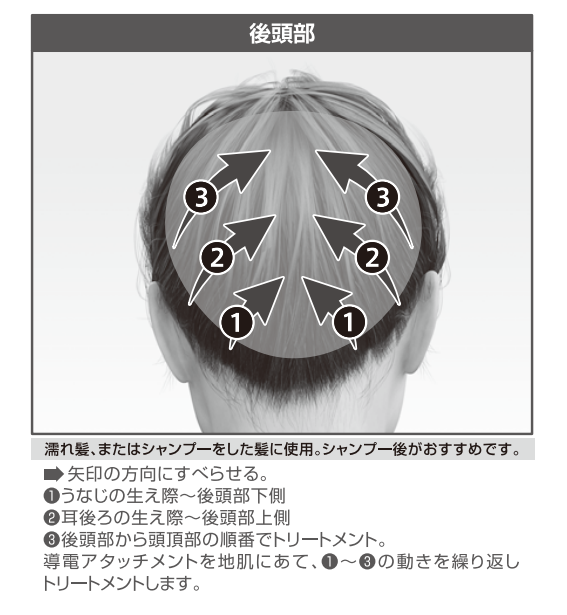 3)導電アタッチメントを頭皮に軽くあて、ゆっくり動かします。
