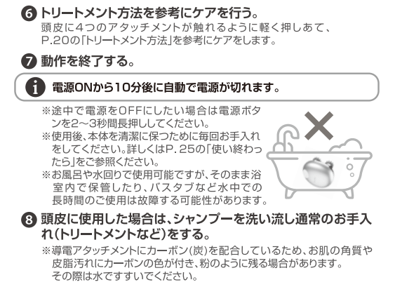 頭皮:入浴中のシャンプー前後の水やお湯で濡れた状態。 または、スカルプケア用品などで十分に濡らしてください。