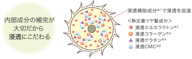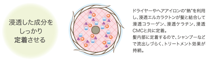 熱定着型の浸透エルカラクトン※2がドライヤーやヘアアイロンの“熱”を利用して浸透コラーゲン※3、浸透ケラチン※4、浸透CMC※5と共に内部で定着。