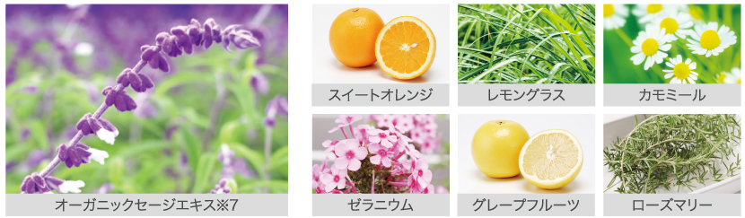※1:PEG/PPG/ポリブチレングリコール-8/5/3グリセリン(保湿成分) ※2:γ-ドコサラクトン、プロパンジオール、フィトステロールズ、ジステアリルジモニウムクロリド、ベヘントリモニウムクロリド(全て毛髪補修成分)※3:加水分解コラーゲン(保湿成分) ※4:加水分解ケラチン(羊毛)(毛髪補修成分) ※5:ポリクオタニウム-61(保湿成分) ※6:香料 ※7:セージ葉エキス(保湿成分)