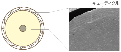健康な髪はキューティクルの層がキレイに整い、髪内部も詰まっているので、ツヤ・手触りの良い状態です。