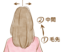 ①髪全体に1度につけるのではなく、左右半分に分け、「毛先」→「中間」につけていきます。