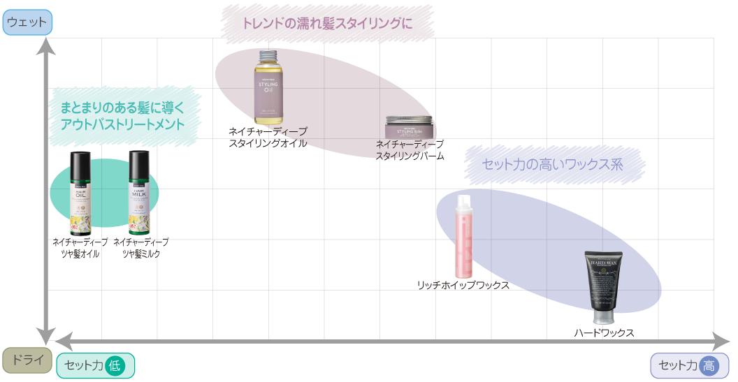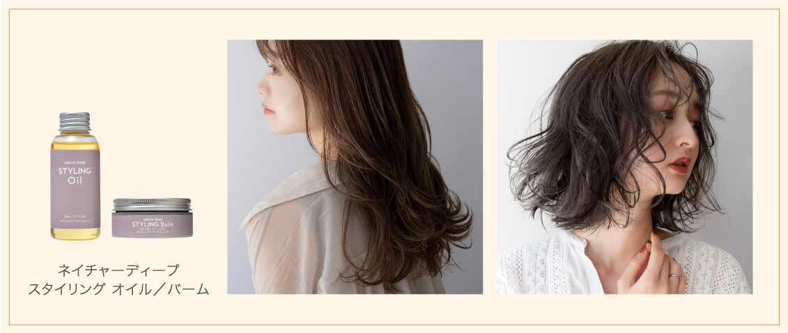 ネイチャーディープ スタイリングオイル/バームは下記のようなスタイリングにお使いください。
