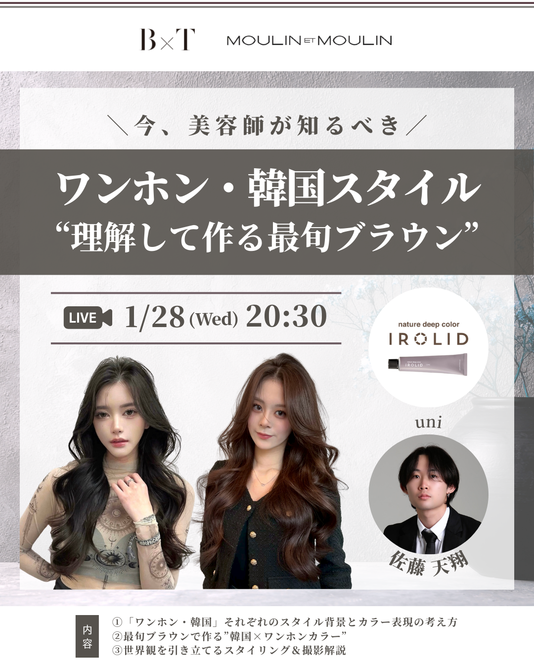 今回は、Instagramのフォロワー3.8万人!韓国のトレンドヘアならおまかせのuniの佐藤天翔さんに、施術しながら「ワンホン・韓国」それぞれのスタイルの背景やカラー表現の考え方を解説いただきます!さらに、トレンドのスタイリングや撮影方法についてもお伝えいただきます♪
