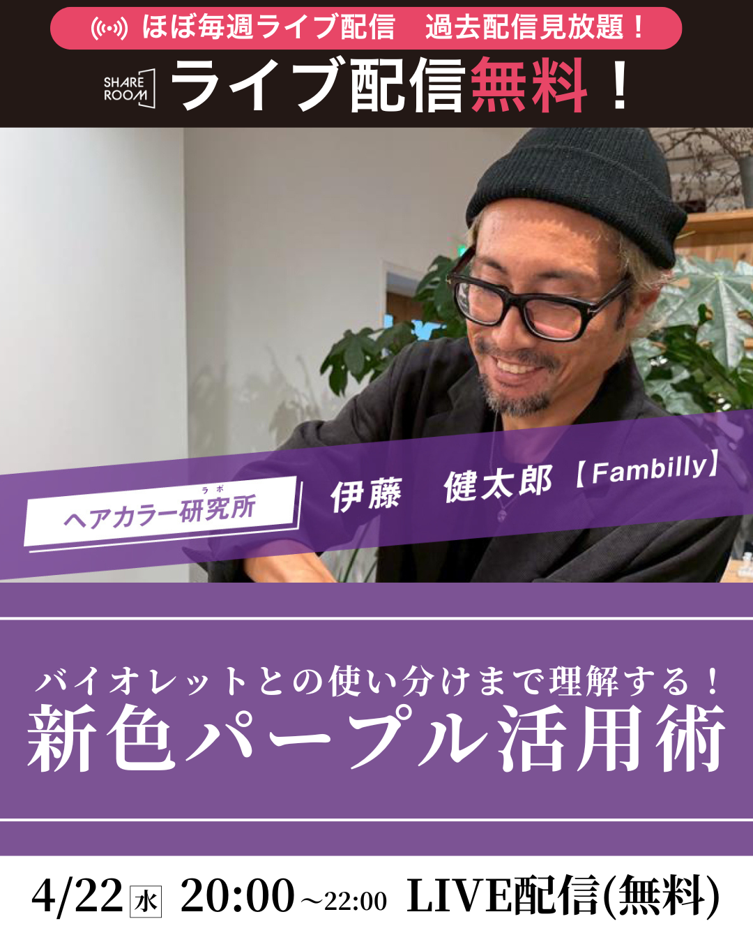 4/22(水) 20:00から、「ヘアカラー研究所」無料ライブをSHARE ROOMにて開催します!