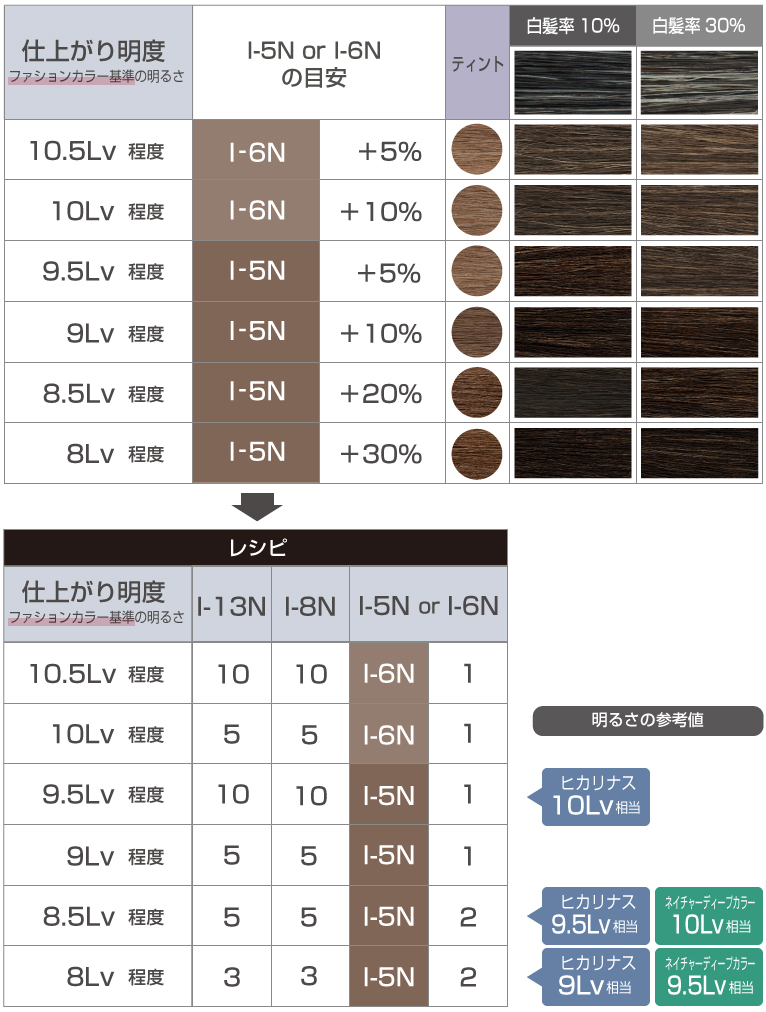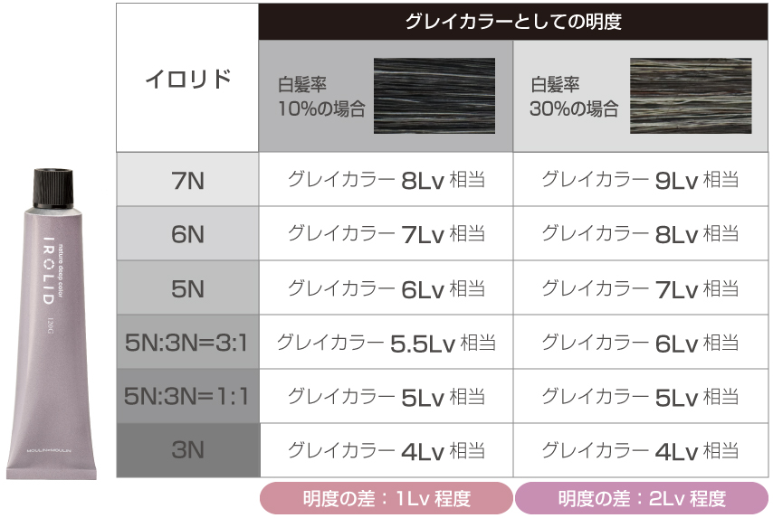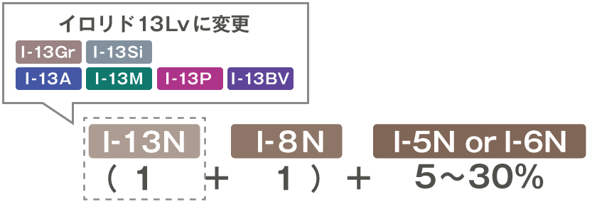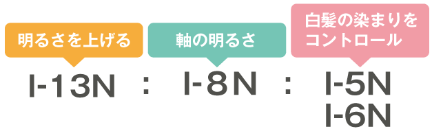 イロリドでは、8Nを軸に、高明度の13Nで黒髪を明るく見せつつ、低明度の5N(または6N)で白髪をカバーすることで、気になる白髪を自然になじませ、明るい白髪染めが可能です。