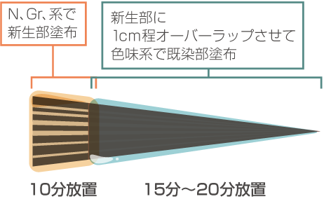- 既染部にも色味をしっかり入るように、新生部塗布後、既染部もすぐ塗布して15分〜20分自然放置します。