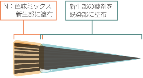 新生部塗布→10分放置→コームでなじませ5分放置→既染部塗布→10分放置
