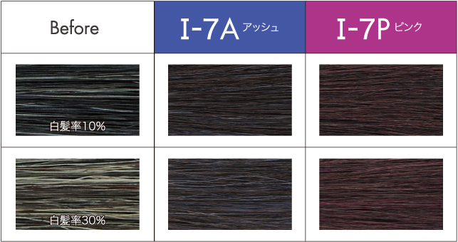 イロリドは濃さがありますので、ピンクやアッシュなどの色味でも7Lv以下であれば、白髪が染まったように見えます。
