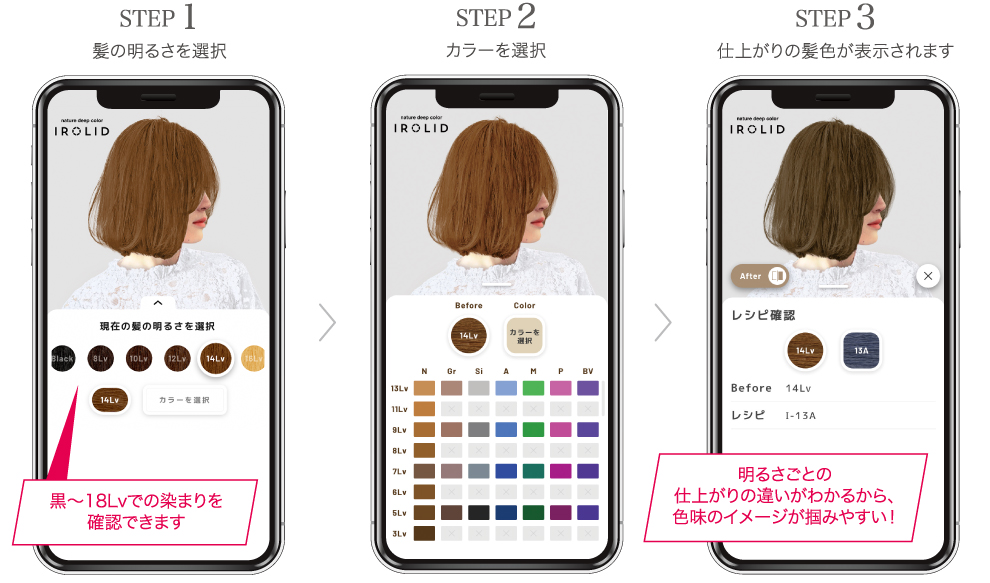 そこで、イロリドでは事前の髪の明るさを選択して、使用するカラーを選択すると、仕上がりの髪色が確認できるカラーシミュレーターをご用意いたしました。