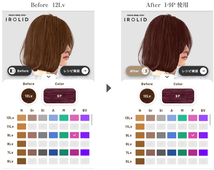 事前の髪の明るさを選択して、使用するカラーを選択すると、仕上がりの髪色が確認できます。