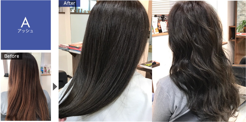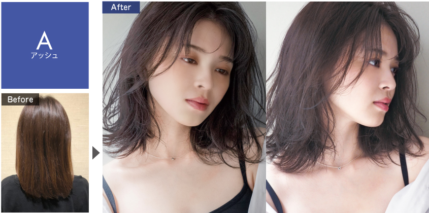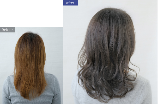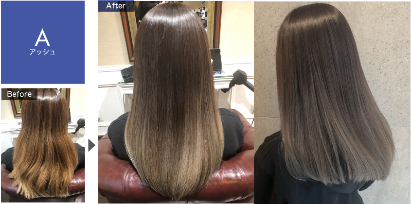 ④ビフォー12~14Lv事例:黄味をしっかり抑え、透明感のあるアッシュカラー