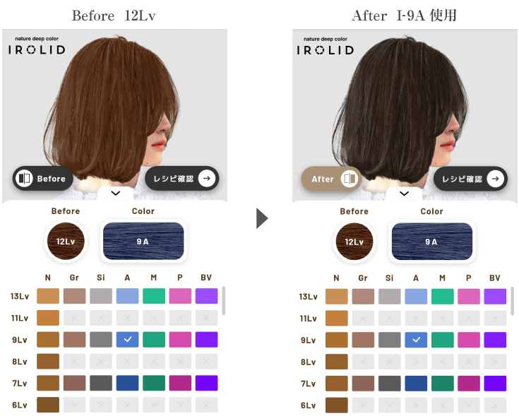 <Before:12Lvのイロリド9Lvアッシュ使用の色味の目安>