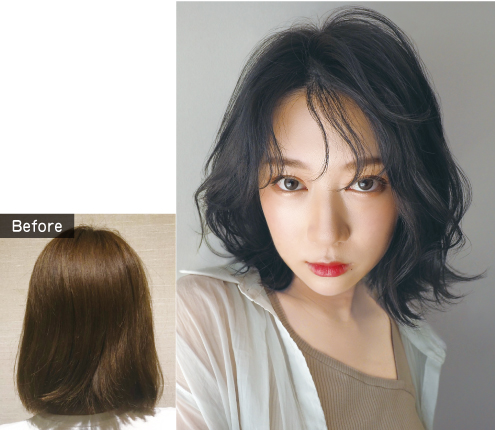 青味はダイレクトに感じにくいですが、室内では髪の赤味を抑えた透明感を感じる暗髪、光が当たると青味を感じます。お仕事柄で派手なカラーが出来ない方でもトライしやすい色味です。