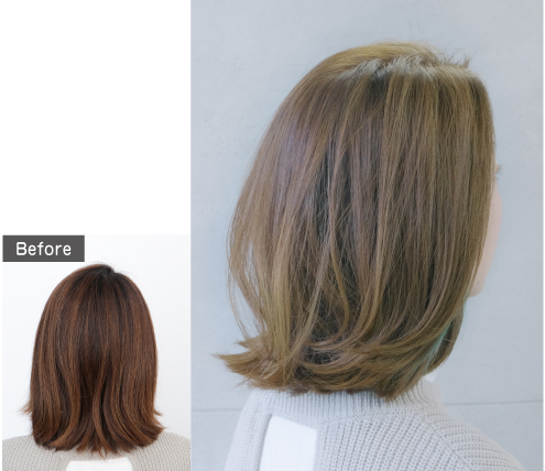 ①ビフォー8~12Lv事例:赤味出やすい髪も、やわらかなマットベージュ系に
