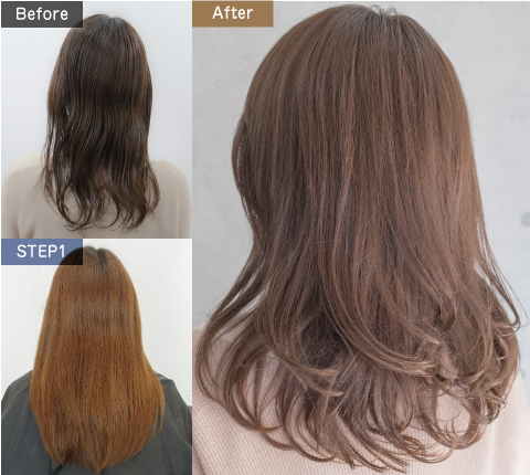 既染部にハイライトやグラデーションを活かしながら、赤味を抑えたナチュラルブラウンの色味を補給。
