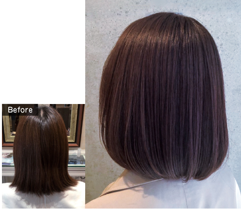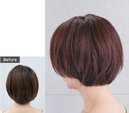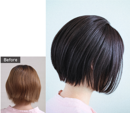 暗すぎる色を使わずに、褪色した髪の黄味をカバーするブルーバイオレットの7Lvをベースに、トリートメントティント(コントロールカラー)のレッドをMix。暖色系の色味と深さのあるやわらかいブラウンに仕上がりました。(ムーランエムーラン事例)