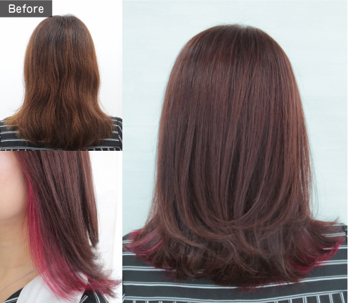 インナーカラーにはビビットな色味で染められる塩基性染料を使用したトリートメントカラー「ノジア」を使用。ブリーチ箇所の黄味を補正するため、カラーベースのレッドにブルーをわずかに加えて、印象的なディープレッド系のポイントカラーに仕上げました。(ムーランエムーラン事例)