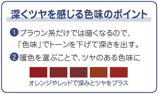 そこでポイントとなるのは、ブラウン系だけでトーンを下げてしまうのではなく、赤やオレンジ、紫系の暖色を中心とした「色味」でトーンを下げることです。