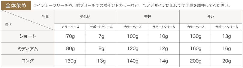 カラーベースの使用量としてはアルカリ1剤と比べてかなり多くなります。使用量は下記を目安にしてください。