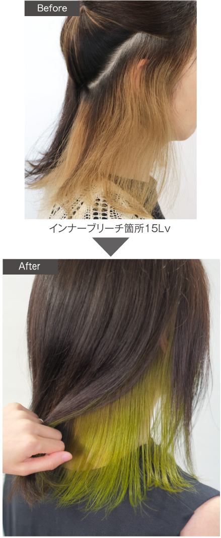 表面の落ち着いたトーンとコントラストを付けたおしゃれなスタイルに。よりビビッドなライムグリーンのような色味を狙う場合は、17Lv以上まで事前ブリーチをするのがオススメです。