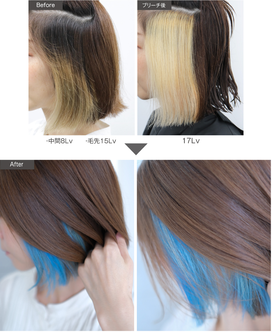 ダメージが大きいと色抜けや色ムラの原因になります。ブリーチ時、カラー時などの前後処理は必ず行ってください。髪の状態によってブリーチにどこまで耐えられるかは判断が必要です。