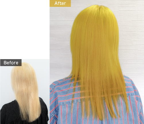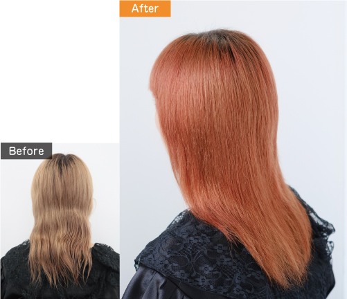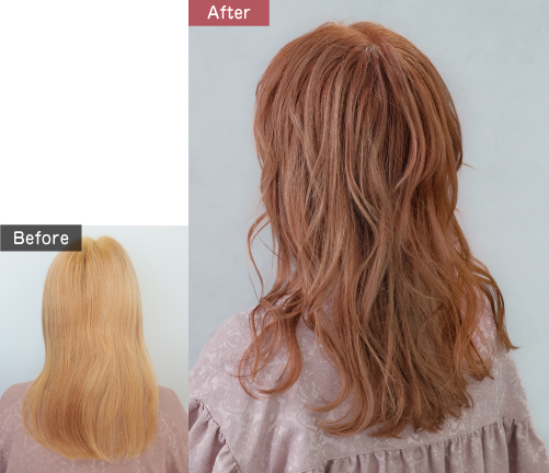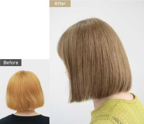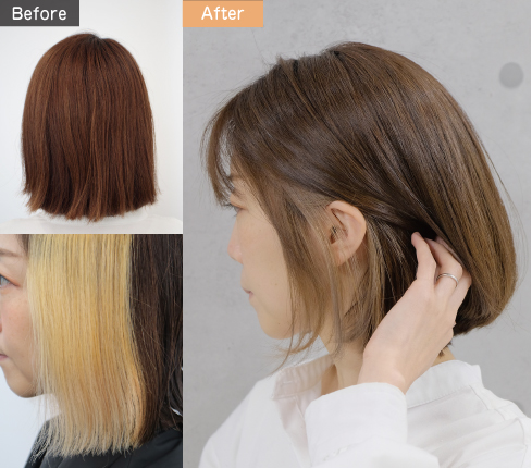 赤味を抑え、マスタードっぽいブロンドベージュの仕上がりに。ベージュにナチュラルを加えることで、ベースを整え色むら無く、つながりをよくしています。