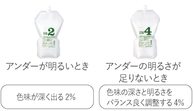アンダーが明るいときは2剤は2%を使用した方が、色の濃さがはっきりと出ます。