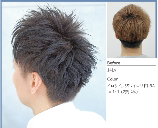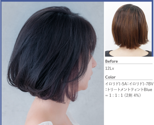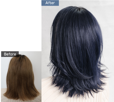 イロリドは濃厚な色味が発色するカラーなので、青味・グレイ味をしっかり感じる暗髪を実現できます。