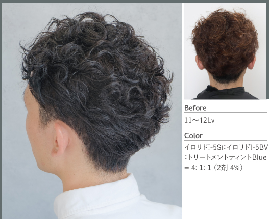 5Lvのシルバーに、明るさと補色調整でオレンジ味を抑える9LvのアッシュをMixし、2剤も4%を使用しました。