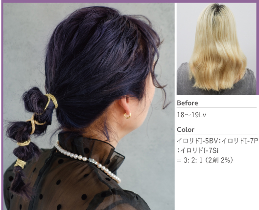 16Lvまでブリーチして、5Lvのアッシュとコントロールカラーのブルーを使ったオンカラーで青味がしっかり出るように。