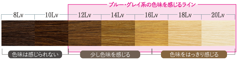ブルーやグレイの色味を出していくためには事前の髪色は12~13Lv以上、よりはっきりとした色味を出すにはブリーチが必要になってきます。