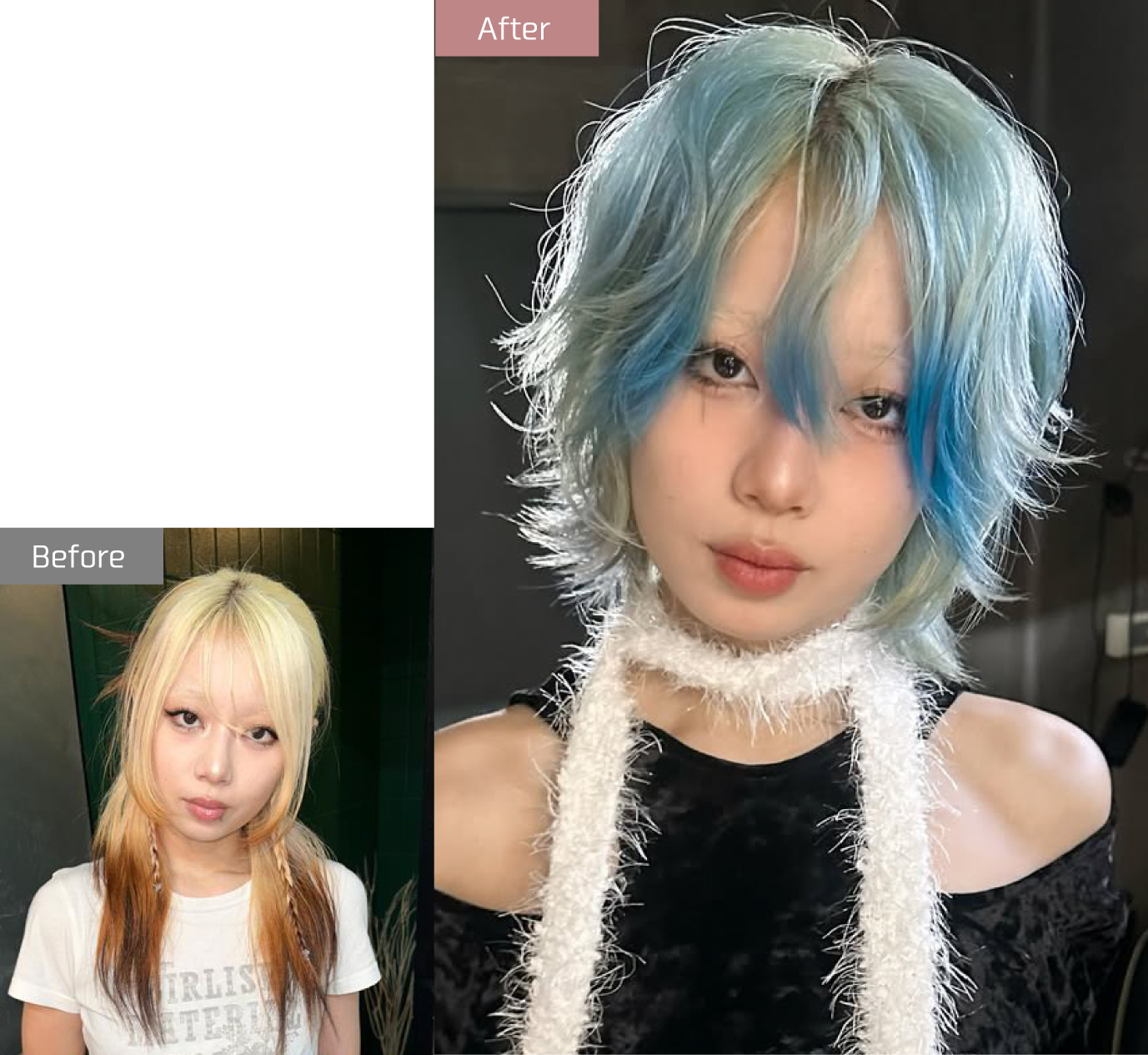 ウルフカットとハイトーンデザインを組み合わせたスタイルで、国内外のお客さまを多く惹きつける。