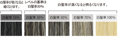 そこで、各系統の白髪率別の明るさの違いや、顔周り等部分的に白髪が多い時の対処方法などをご紹介します。