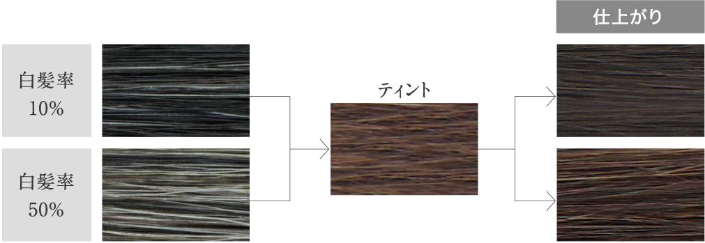 同じ薬剤で染めても、元の白髪率が違うと仕上がりの明るさに差が出ます。