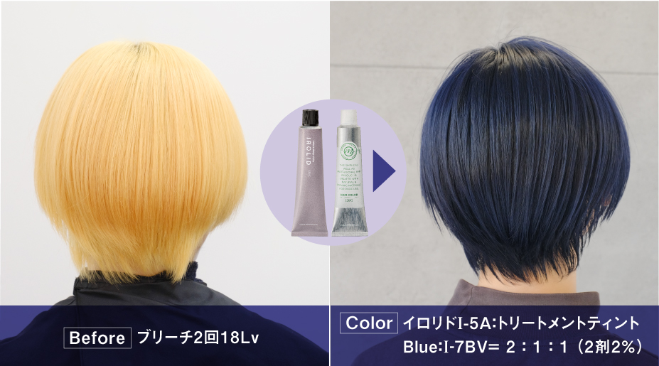 - ブリーチ1回で18Lvに整えてから5Lvのアッシュ+コントロールカラーBlue+補色のバイオレットをMixしてオンカラー。